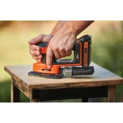 The BLACK+DECKER® MOUSE® 20V MAX* cordless sheet sander removes material at 12,000 OPM (orbits per minute) and has a finger attachment to sand hard-to-reach surfaces. It has a 2-position grip and a hook-and-loop system to change the sandpaper quickly. The on-board dust bag can be detached and emptied. The sander is powered by a rechargeable 20V MAX* lithium ion battery.