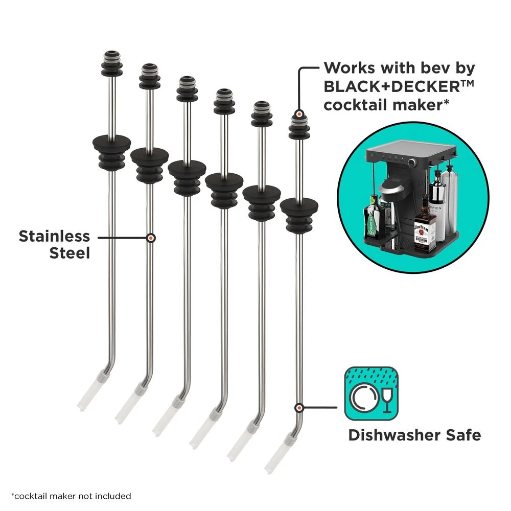 Enhance your experience while using the bev by BLACK+DECKER⢠cocktail maker (sold separately) with this pack of 6 replacement straws that draw liquid from the water dispenser & liquor bottles.  For 21+. Drink responsibly.