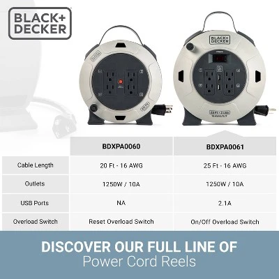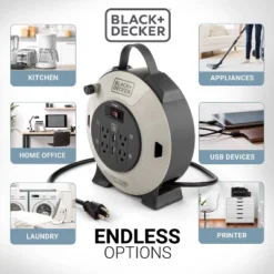 - Get Power Anywhere: Always make sure you have access to a power outlet in any room in your home with this Retractable Extension Cord Reel from BLACK + DECKER! With a 16AWG cable, this electric cord reel is ideal for small appliances and tools.