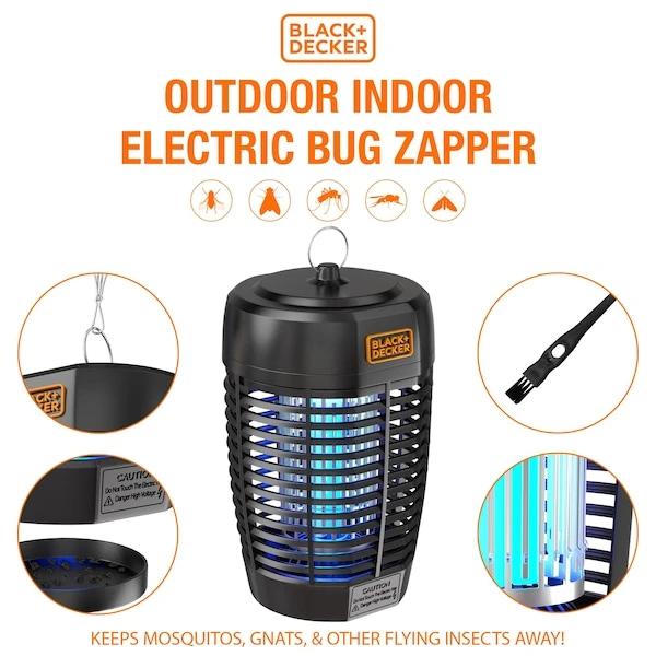 Whether your yard is taken over by black flies, mosquitoes, gnats, greenheads, wasps, or other biting pests, the Electric Bug Zapper from Black+Decker provides effortless extermination from dusk to dawn. Simply set on a table or hang up high, plug in, and see bothersome bugs be lured to their doom! Non-toxic ultraviolet light is dim and quietly discreet–but powerful enough to protect interior rooms or outdoor patios both large and small.