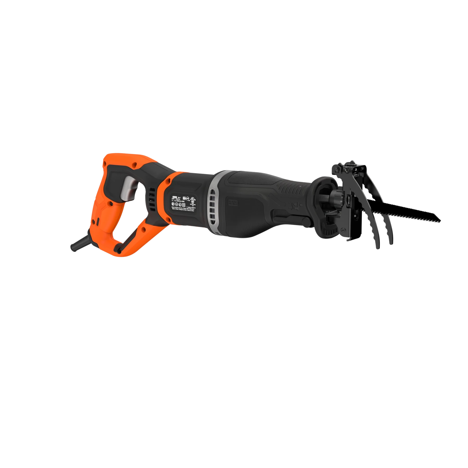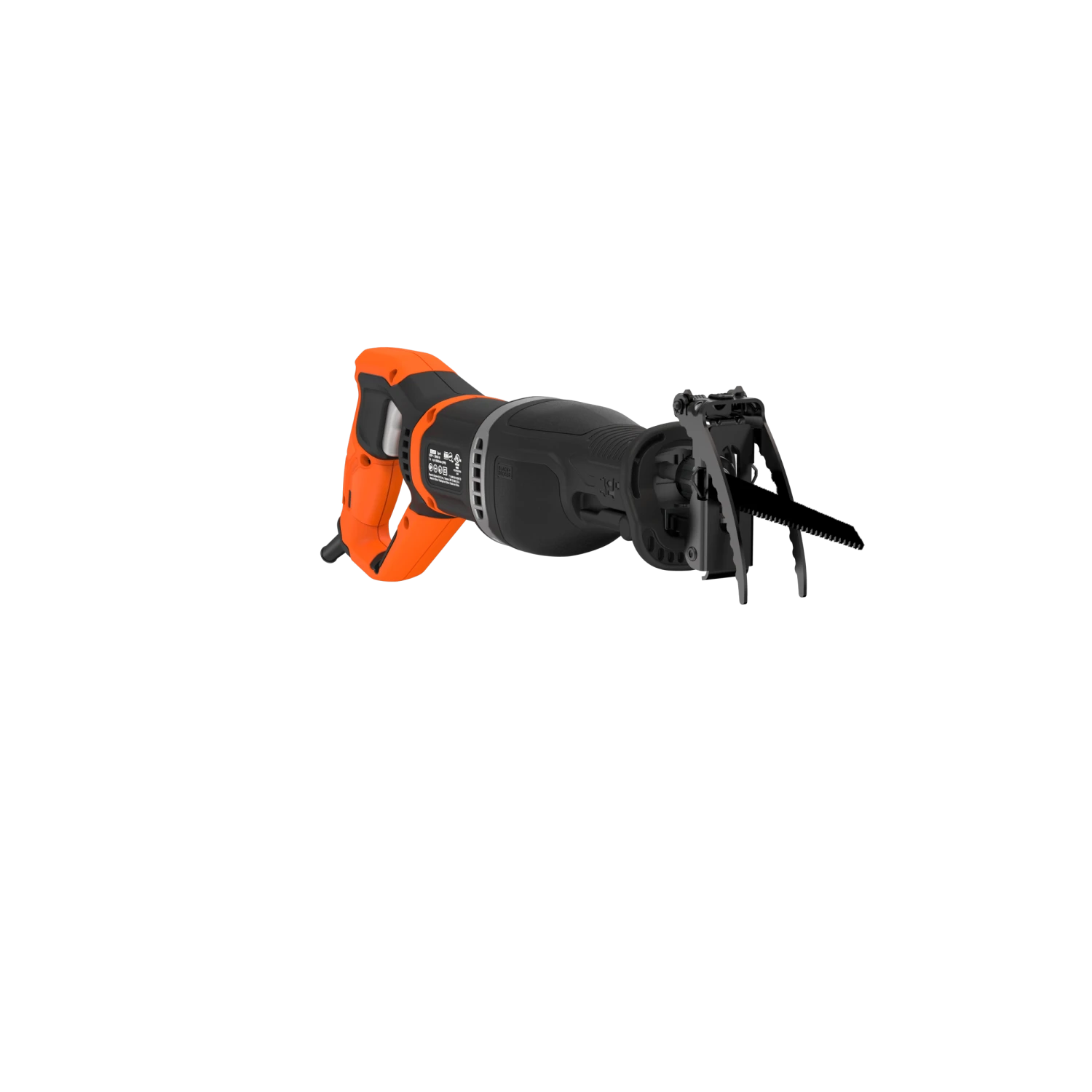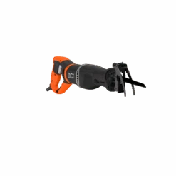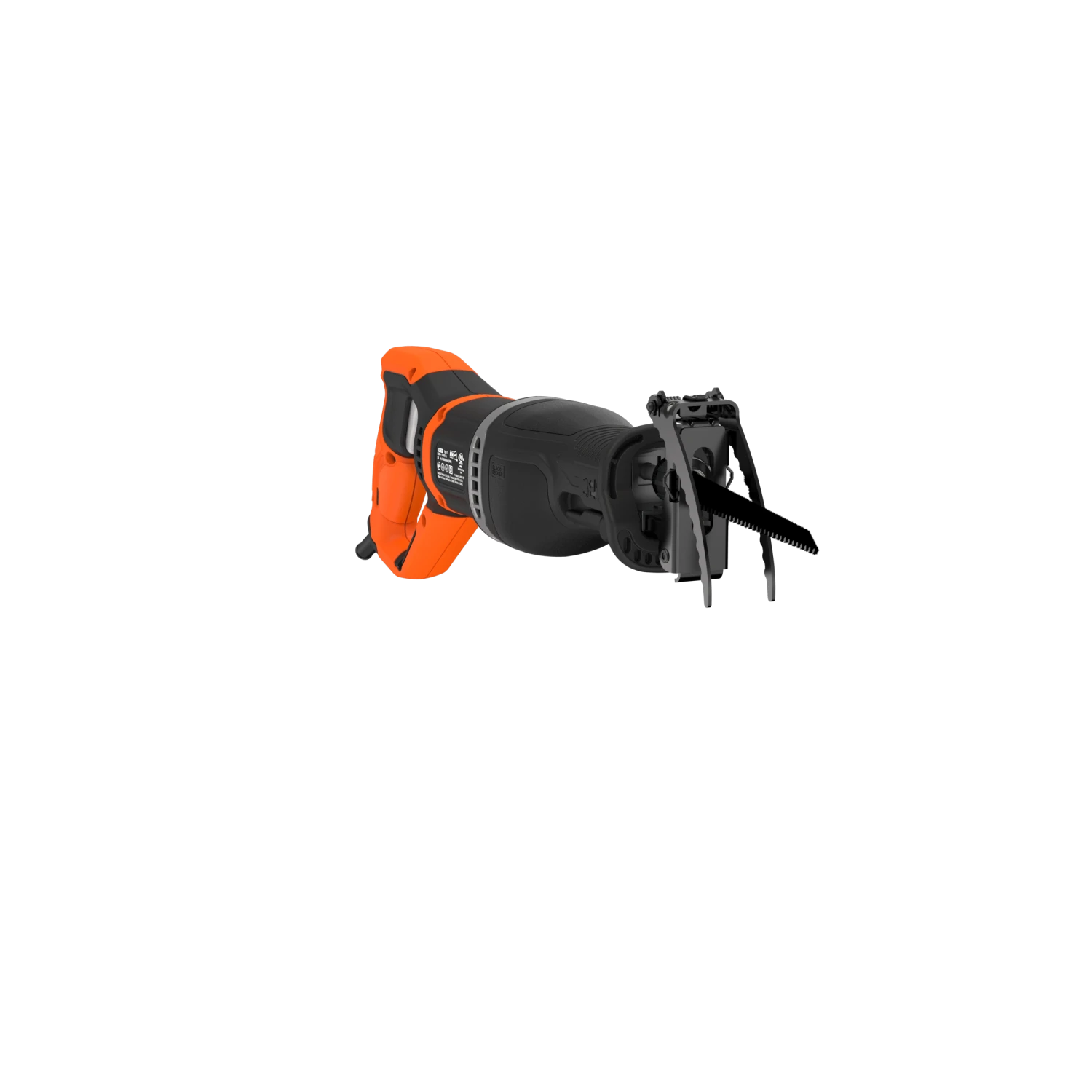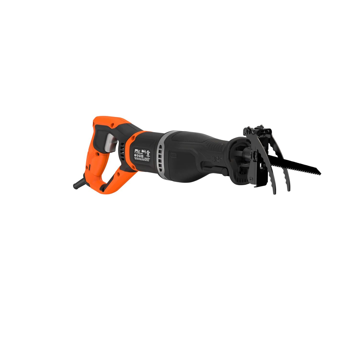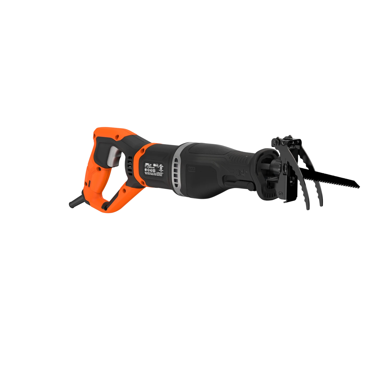The BLACK+DECKER® corded pruning saw includes a branch grabber and can also be used as a reciprocating saw by removing the branch grabber and installing the wood cutting shoe.