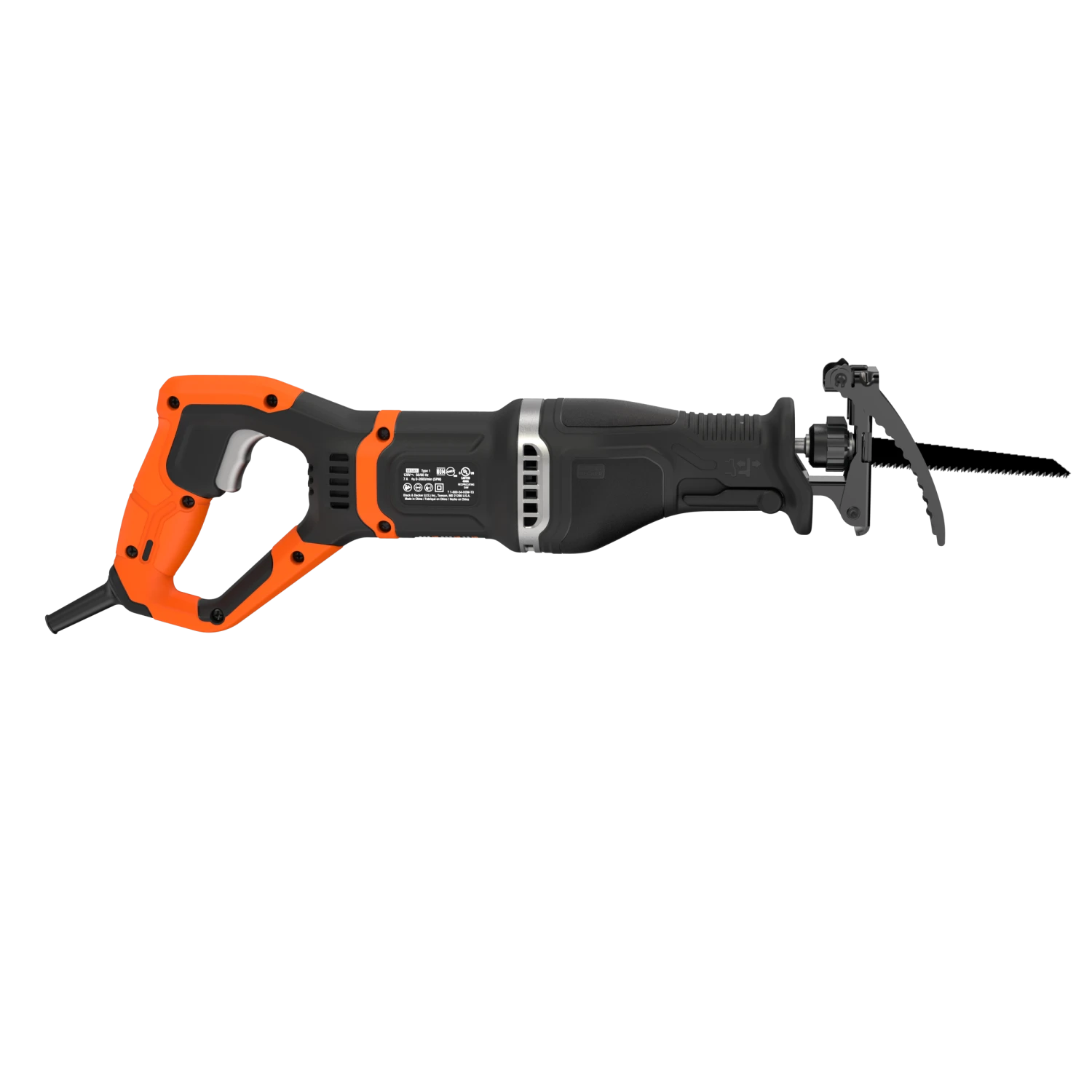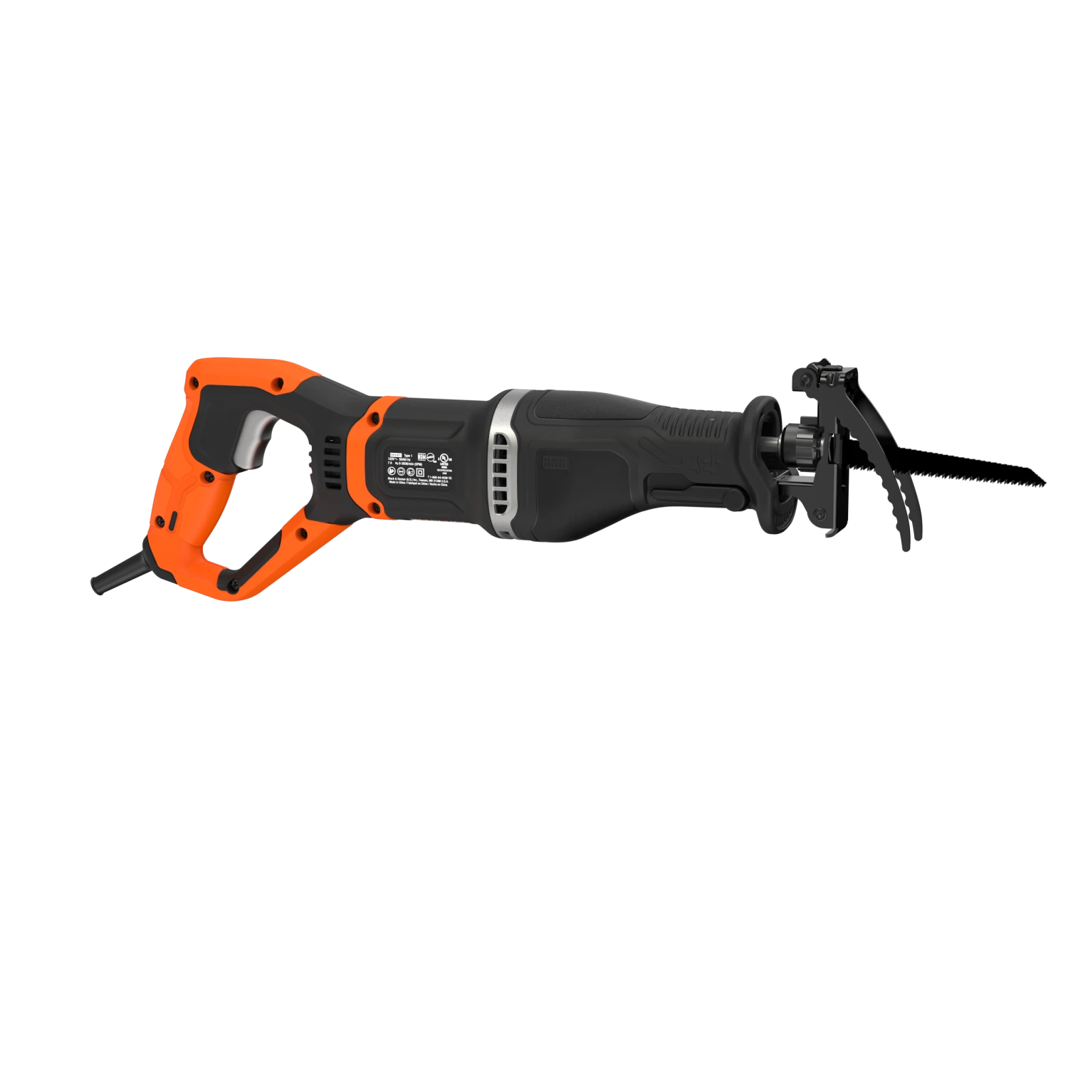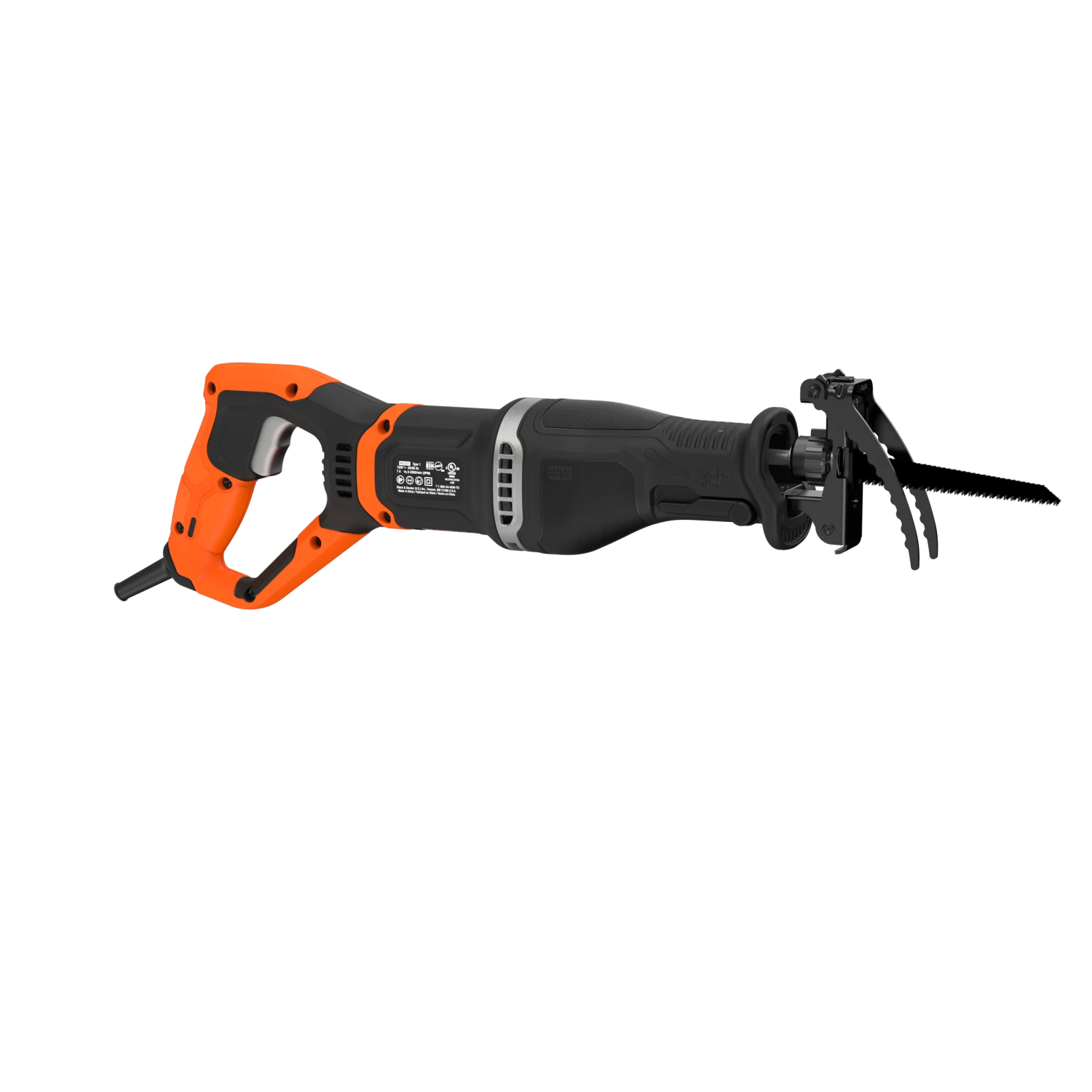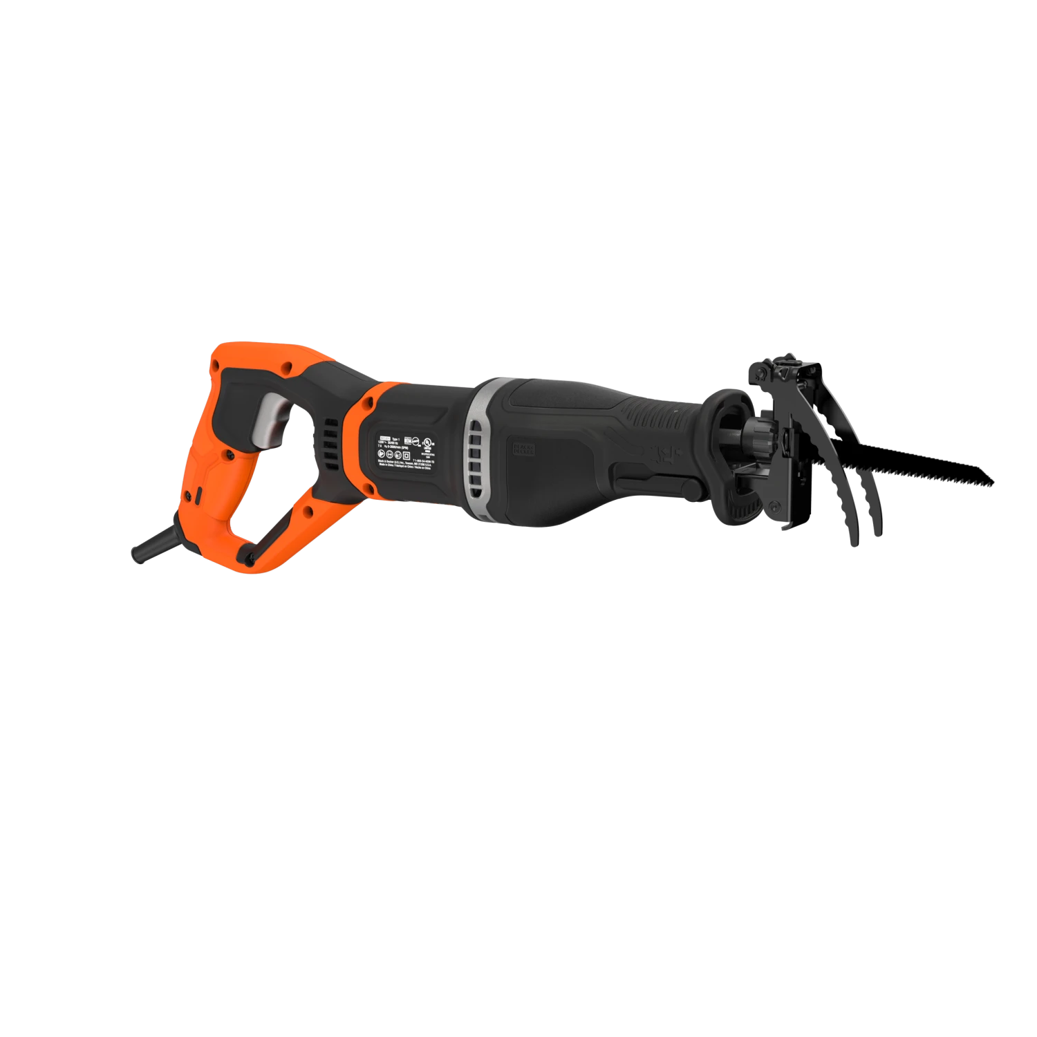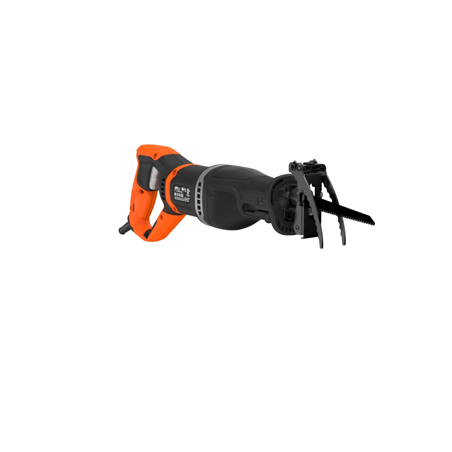 The BLACK+DECKER® corded pruning saw includes a branch grabber and can also be used as a reciprocating saw by removing the branch grabber and installing the wood cutting shoe.