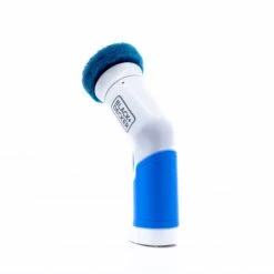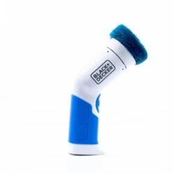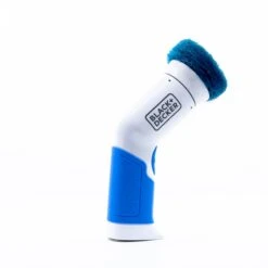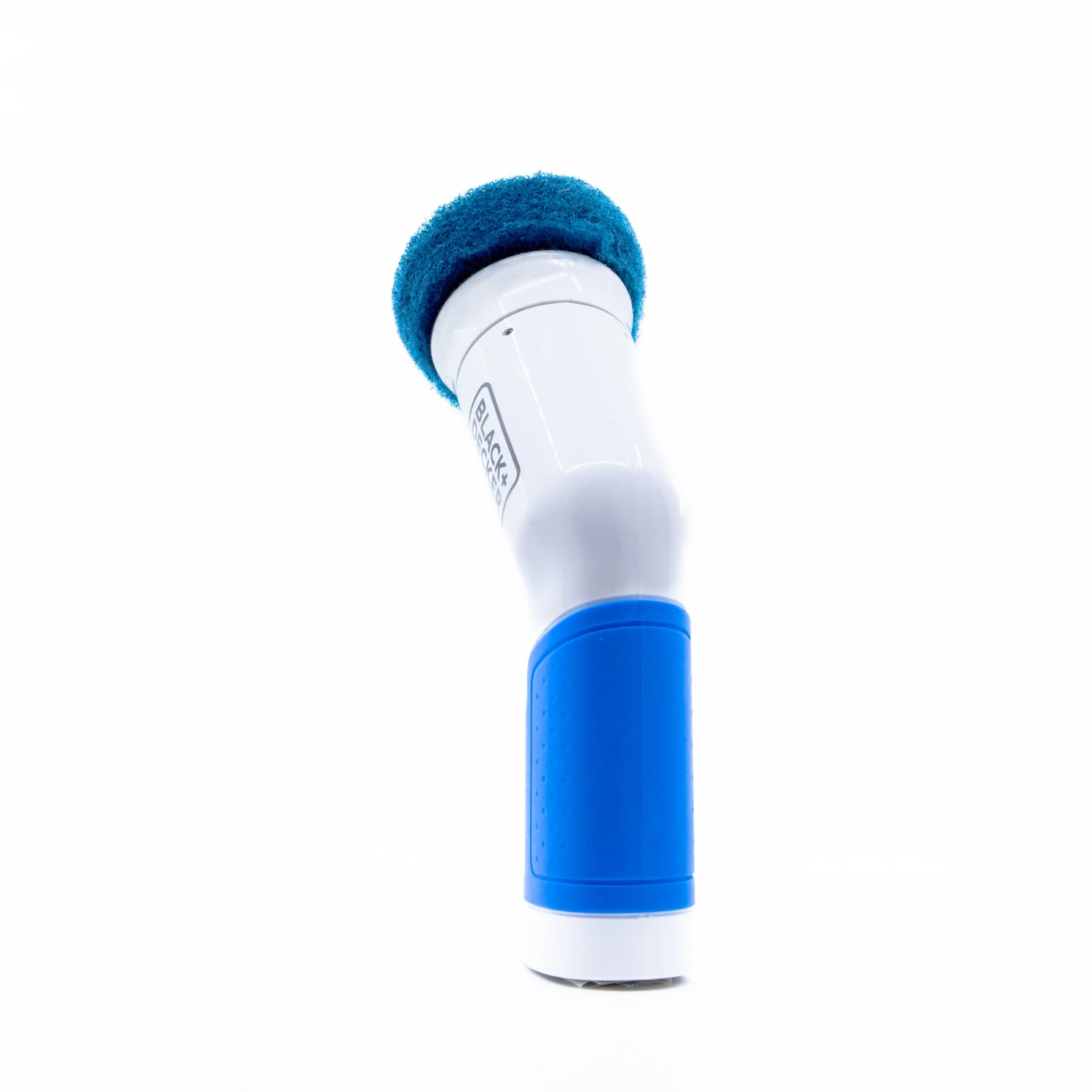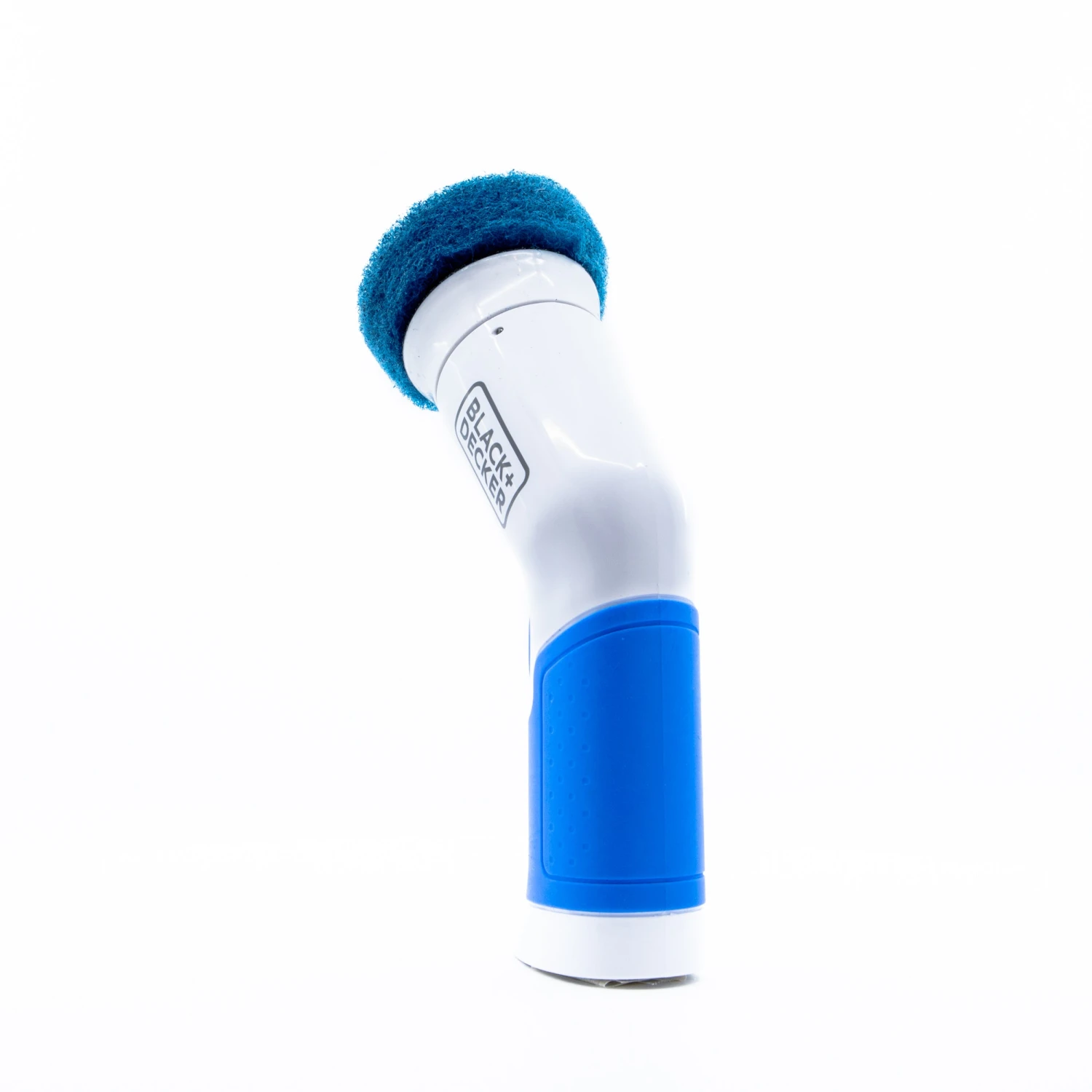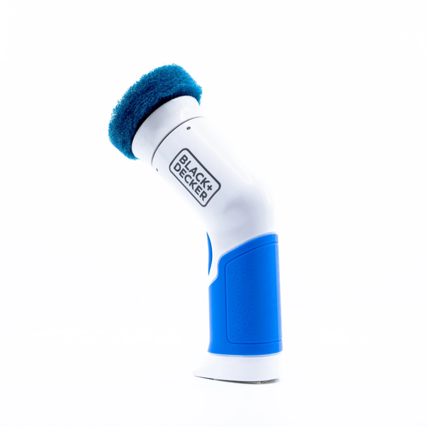 BLACK+DECKERĀ® fully submersible power scrubber has a scraper edge. Included are: power scrubber, 4 AA Batteries, 2 heavy duty scrub pads.