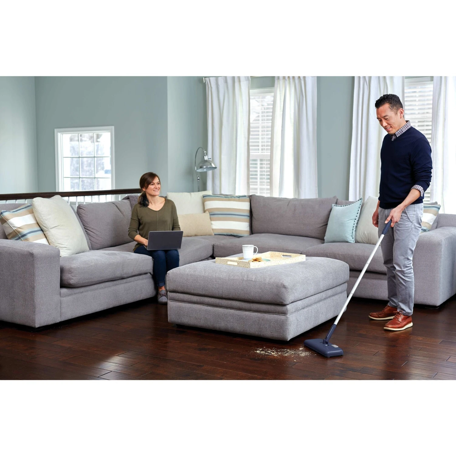 The BLACK+DECKERÂŽ 30 Minute cordless powered floor sweeper is lightweight and easy to use. Cleaning floors, under furniture, and along baseboards is a breeze.
